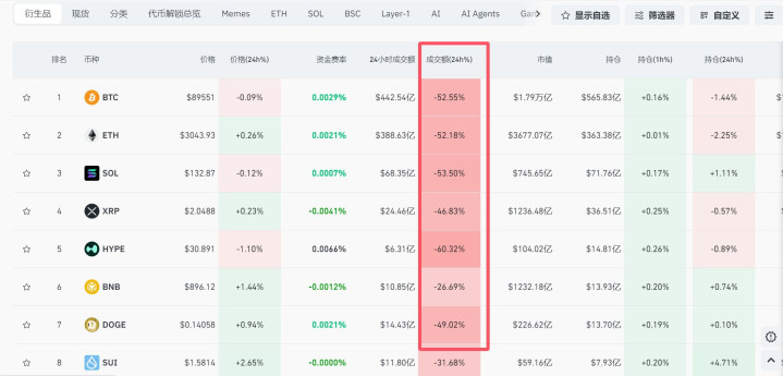 12月7日上午,比特币一度向下跌破89000美元,而在6日晚它曾向上触及9万美元。截至发稿,加密货币市场涨跌互现,主要品种成交额全线大幅下跌,近24小时内,比特币、以太坊、SOL等主要品种成交额均腰斩,跌超50%。