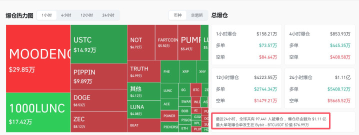 Coinglass数据显示,近24小时内市场近10万人被爆仓,爆仓总金额为1.11亿美元。